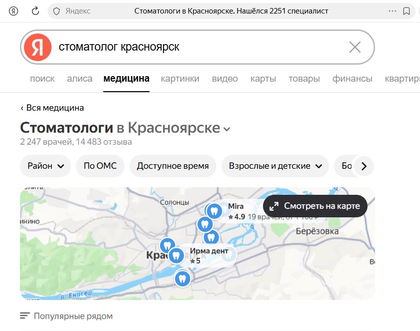 Если запрос носит информационный характер («что такое кариес», «как проводится вакцинация»), вкладка не появляется.
