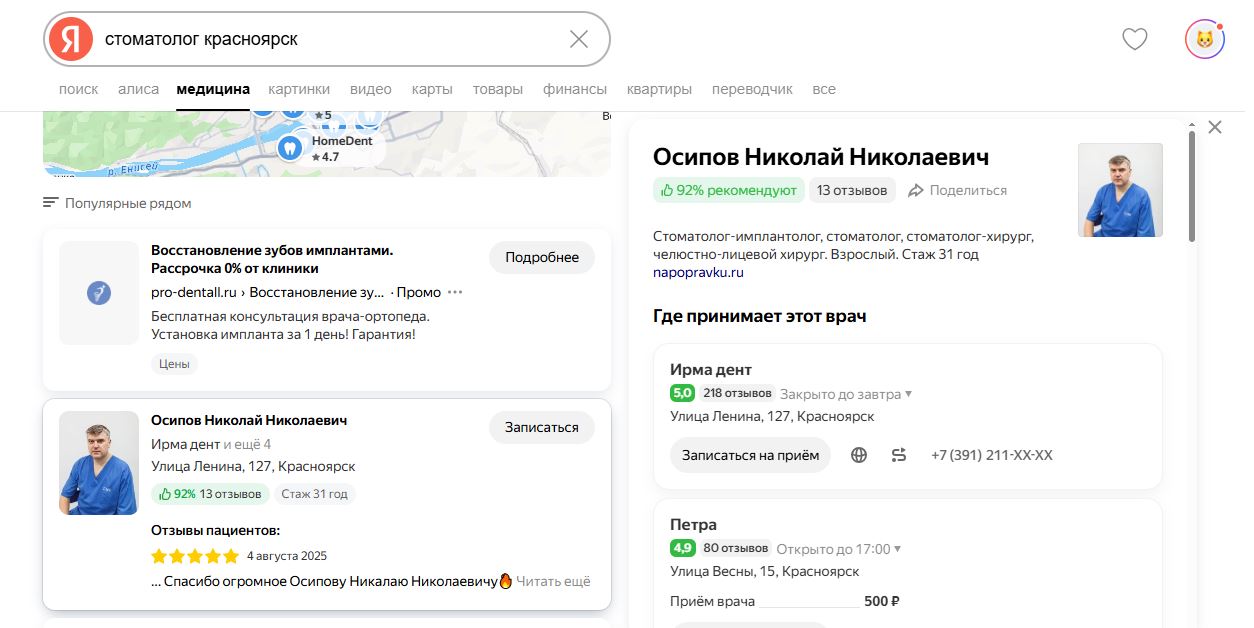 Это не просто список сайтов — это отдельный интерфейс с карточками специалистов и возможностью записи на приём прямо из поиска.